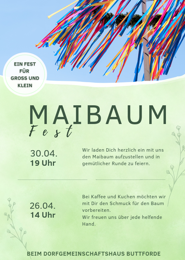 Am Donnerstag, den 30.4. , um 19 Uhr beginnt das Maibaumstellen am Dorfgemeinschaftshaus in Buttforde in gemütlicher Runde, auch hier kommt das leibliche Wohl sicher nicht zu kurz.