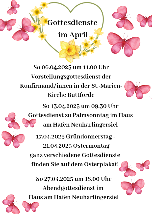 28 März 2025 Termine ev. Gottesdienste im April von Uwe Seidler | Veröffentlicht in: Allgemein | 0 In Zusammenarbeit mit Pastorin Uelsmann stellen wir hier die Termine für die Gottesdienste der ev. Kirchengemeinde im April 2025 zur Verfügung